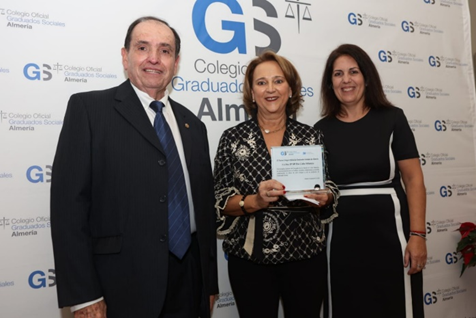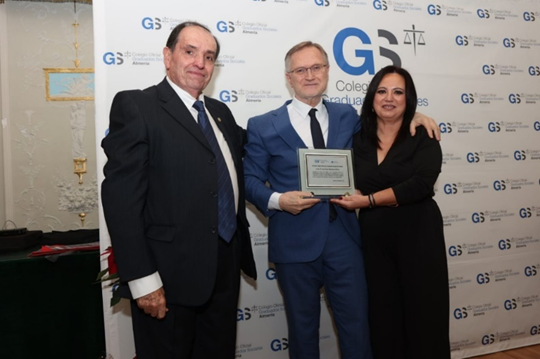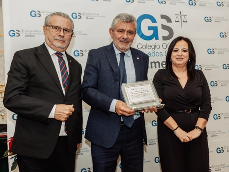 Alfonso Hernández Quereda, secretario general del C.G.C.O.S de España entrega el reconocimiento a Juan Ramón Fernández Imbernón, Secretario General de la Subdelegación del Gobierno en Almería y María del Mar Ayala Andújar, presidenta del Colegio de Almería.