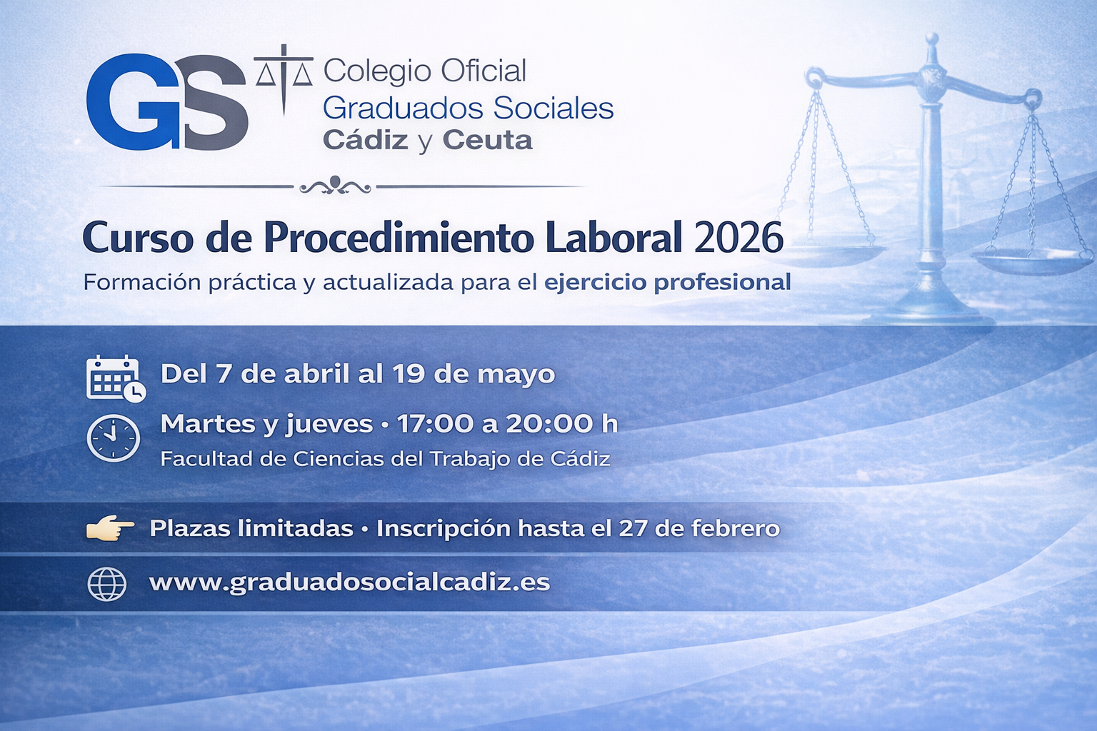 El curso se celebrará del 7 de abril al 19 de mayo de 2026, en horario de 17:00 a 20:00 horas, los martes y jueves, y tendrá lugar en el Aula nº 13 de la Facultad de Ciencias del Trabajo de Cádiz, situada en la calle Enrique Villegas Vélez, nº 1. La formación consta de 36 horas lectivas, estructuradas en 12 temas, con un enfoque eminentemente práctico y actualizado conforme a las últimas modificaciones de la Ley Reguladora de la Jurisdicción Social .