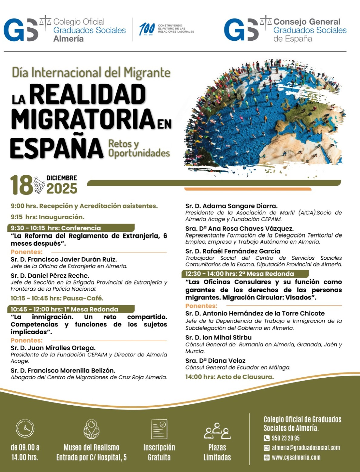 El Colegio Oficial de Graduados Sociales de Almería, con la colaboración del Consejo General de Colegios Oficiales de Graduados Sociales de España, celebrará el próximo jueves, 18 de diciembre, una jornada formativa con motivo del Día Internacional del Migrante, enmarcada asimismo en los actos conmemorativos del Centenario de la profesión de Graduado Social (1925–2025).