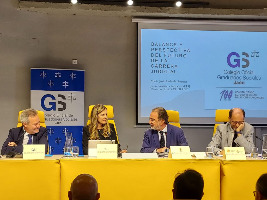 Posteriormente, se celebró una mesa de diálogo sobre la evolución de la carrera judicial y el papel de los colegios profesionales, en la que intervinieron Beatriz Pérez Heredia, presidenta de la Sala de lo Social del TSJA; María Dolores Martín Cabrera, magistrada del Juzgado de lo Social nº 4 de Jaén; y Juan Fernández Henares, vicepresidente primero del Consejo General de Graduados Sociales. Moderó el encuentro la magistrada Inmaculada Ruíz del Real.